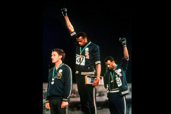 Поднявшись на пьедестал почета, Томми Смит (золотая медаль) и Джон Карлос (бронзовая медаль) во время исполнения гимна США склонили головы и подняли кулаки в черных перчатках. Это был известный символ борьбы афроамериканцев за свои права.
